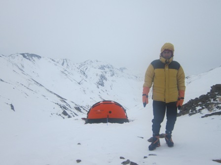 روز شنبه 28 دی ، وزش باد شدت بسیار زیادی یافته بود و هوا هم سردتر، به حدی که امکان باز کردن زیپ جادر هم نبود. سایت های هواشناسی داخلی و خارجی که در روز چهارشنبه بررسی کرده بودیم ، برای روز شنبه هوای نیمه ابری با حدود 20 کیلومتر باد پیش بینی کرده بوند. با این حال ما با یک هوای کاملاً ابری با وزش بادی به مراتب سنگین تر از 20 کیلومتر مواجه شدیم. به همین دلیل به سمت قله حرکت نکردیم و تصمیم گرفتین صبر کنیم تا هوا آرامتر شود ، صبری که بی نتیجه بود. البته از حوالی ظهر به بعد هوا به سمت صاف شدن می رفت اما باد همچنان سنگین بود. با توجه به اینکه برنامه ما به علت شرایط جوی یک روز اضافه شد و صعود ما به قله خلنو به روز یکشنبه موکول شد ، تلاش کردیم تا با با اراک تماس برقرار کنیم و علیرغم تلاش فراوان و رفتن به ارتفاع بلندتری که مجاور ما بود این امر میسر نشد. در طول شب سرمای هوا و باد به حدی رسید که آبی که داخل فلاسک و در کوله قرار داشت یخ بزند.